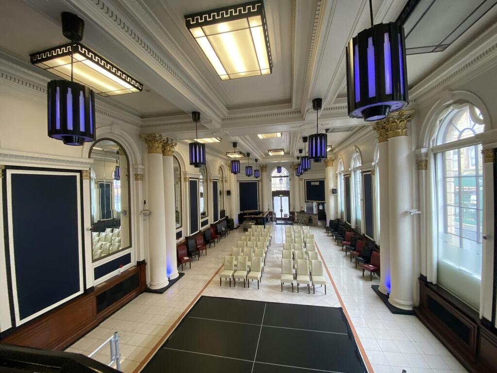 Ground floor: An imposing former banking hall space with polished stone tile floor, ornate wall and ceiling features, large columns and pendant lights, benefitting from a bar servery, trade kitchen space, storage and accessible WCs to the rear. The highest floor to ceiling height in the main area is approximately 6.5m.