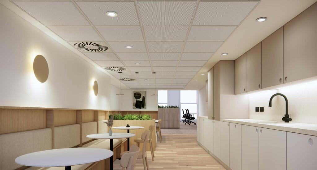 - 10-12 person boardroom, 8 person meeting room, 2 x 2 person meeting rooms, 3 x call rooms, 52 workstations, kitchen, collaboration/breakout spaces and welcome area