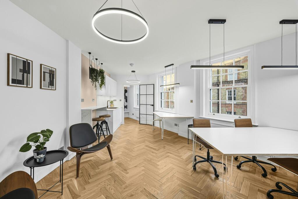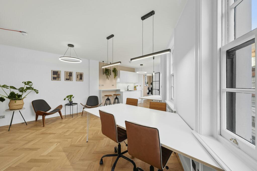 The White House has been curated to provide high quality newly refurbished offices designed to stand out. This suite has been re-visualised with warm wood floors and sunny windows complemented by bespoke fitted furniture and the creation of a comfy 1-2 person meeting room - perfect for those never ending zoom calls. The building is brought together by a stylish art deco theme in the common parts including as well as secure bike storage and shower facilities.