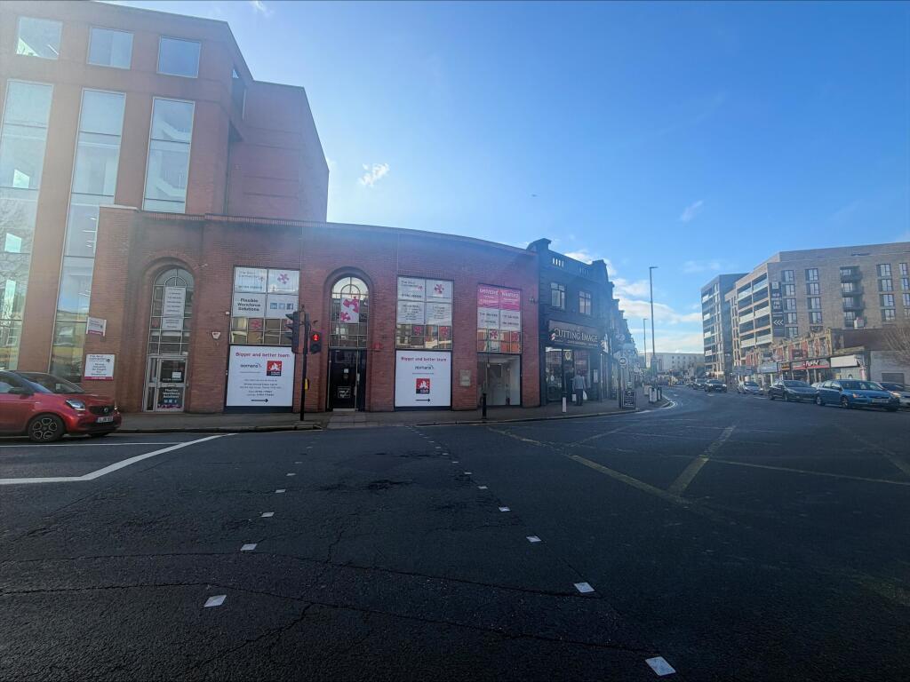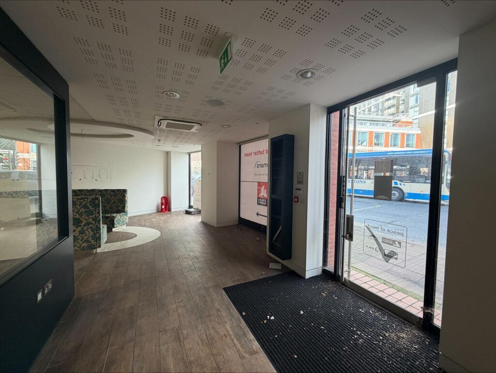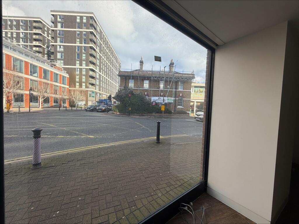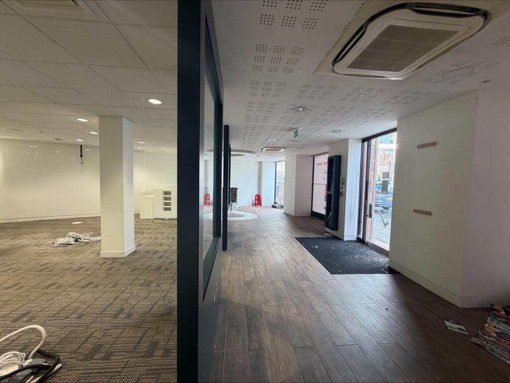 The unit features extensive glazed frontage onto Kingston Road and the High Street, providing strong natural light and advertising potential. Internally, it benefits from suspended ceilings, recessed lighting, and air conditioning.