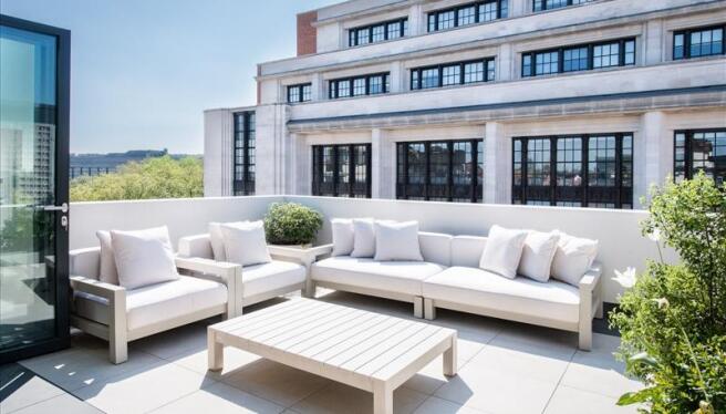 A stunning customized glass staircase offers uninterrupted double height views across London, which in turn leads you up into a unique entertainment and relaxation space offering several lavish areas as well as comfortable dining for 10 people. The open plan feel combines perfectly with two stunning outdoor seating areas that extends seamlessly through from the multiple Bi Folding doors.