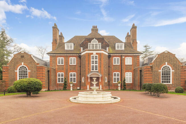 A traditional red brick mansion sits behind ornate security gates and a substantial oval drive. A lovely water feature is the focal point and flower beds adorn the edges-awaiting spring bloom.