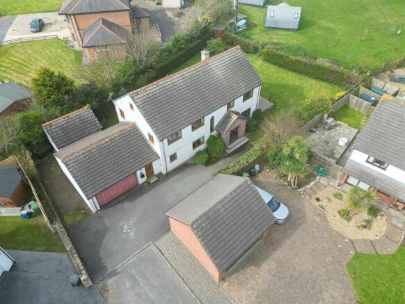 Outside - A Tarmacadam drive leads to a double garage and ample parking spaces for up to 4 vehicles. A large wooden gate gives access to the lawned gardens. with a gate alongside the brick shed. Bordered by walls and hedges but entirely fenced .