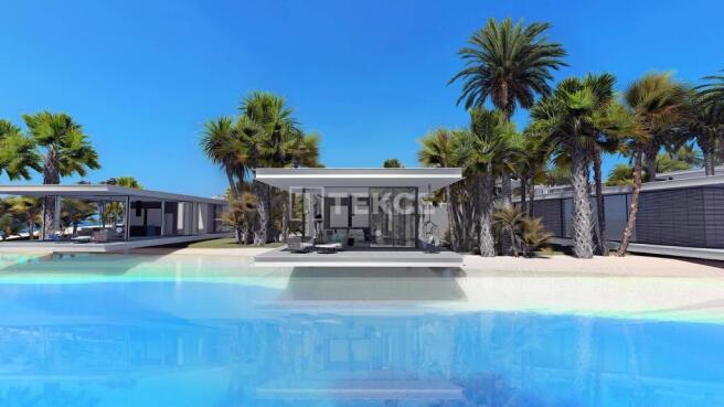 The villas are situated in a mixed project with 80.000 m² total plots. The complex features 16 villas, each with sea and pool views. The complex is ornamented with pools, palm trees, and sunbeds. It provides a pool bar, restaurant, mini market, sauna, Turkish bath, fitness center, and tennis court. The project has laundry service as well. With all these amenities, villas are ideal both for investing and residing.