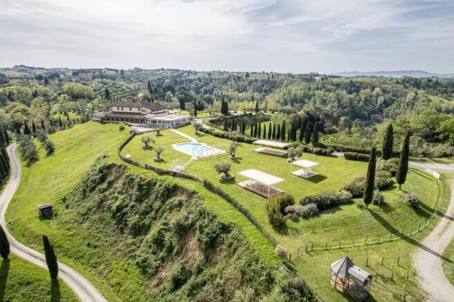This large estate is located on a hillside featuring splendid 360° views of the surrounding countryside, vineyards, olive groves, and fruit trees.