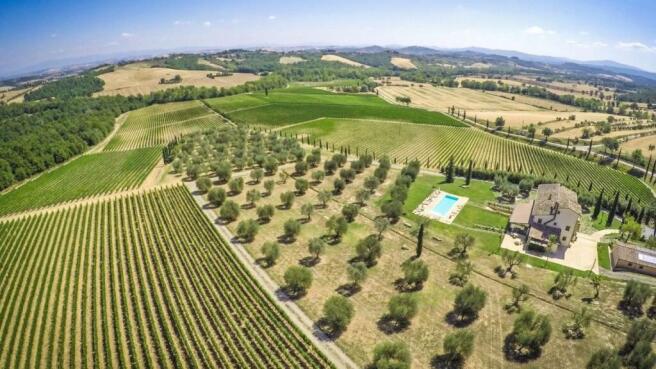Type: 125-hectare/308-acre estate with vineyards and olive groves, a luxury resort with a total surface area of 4584 sq m/49341 sq ft featuring a nineteenth-century 1124 sq m/12098 sq ft two-story manor house with spa, restaurant, 8 suites, 13 bathrooms; a guest house, a farmhouse with staff quarters and warehouses, a modern winemaking cellar, two farmhouses with outbuildings to be restored