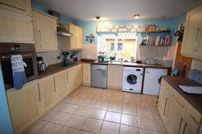 Kitchen - 3.36 x 3.1`3 (11'0" x 10'2"`9'10" ) - with hot and cold stainless steel sink, matching wall and base cupboards including electric hob and canopy over, fan oven, partly tiled walls, plumbing for automatic washing machine, tiled flooring, down lights