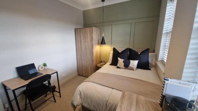 This property has been finished to a high standard, making it ideal for professionals seeking a stylish yet practical home. The room itself features a private en-suite bathroom and is fully furnished with a double wardrobe, chest of drawers, bedside tables, and a dedicated workspace, perfect for those who work remotely or require a quiet area to focus.