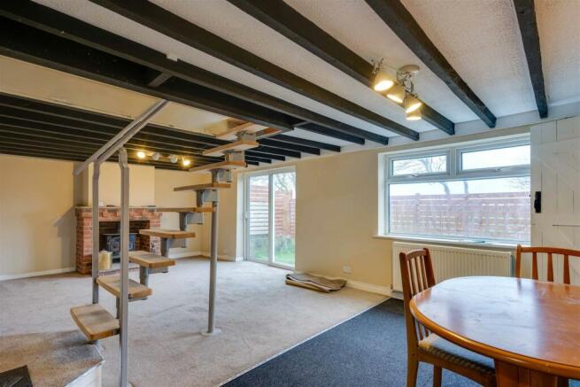 Lounge Diner - 4.00 x 7.00 (13'1" x 22'11") - Spacious open plan living room with a rear facing uPVC window and patio doors opening onto the garden, two radiators, exposed brick fireplace housing a solid fuel stove, exposed ceiling beams, central staircase with floating style treads, access to the WC and kitchen.