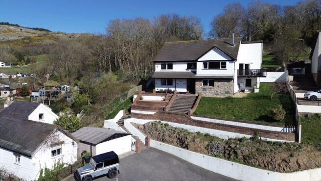 Outside to the front is off road parking for around three cars with access to a large double garage and EV charging point, steps lead upto to the property where there is a patio area benefitting from hillside views with a side gate to access the rear of the property. The rear garden is landscaped with a large, flagged patio area off the kitchen, with attractive stone walls with raised planters with a variety of mature shrubs and plants, steps lead up to a large lawned area surrounded by mature trees with a woodland area to the rear backing onto open farmland with views.