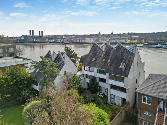 central fireplace) and dining room ideal for entertaining. The drawing and dining rooms have balconies over the water's edge and stunning views across the water to Cutty Sark and Royal Hospital. The large aluminium and timbber windows are double glazed, some with sliding doors.