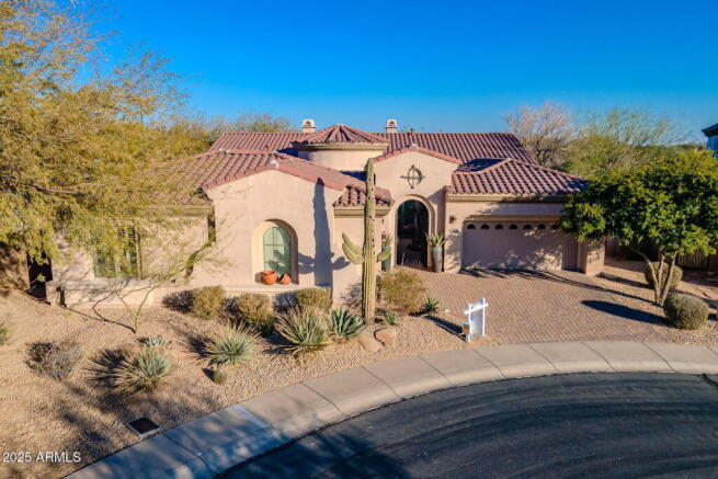This elegant, picture-perfect, single-story home located in the gated community of Sonoran Foothills has been meticulously maintained, thoughtfully designed & includes high-tech features. The immaculate home sits on a prime cul-de-sac lot & features a luxury kitchen with Sub-Zero & Jenn-Air appliances, large primary suite w/ dual custom closets, office with separate entrance, custom iron gate & 2 fireplaces. It's an entertainer's dream with elegant formal spaces that flow seamlessly into the open-concept living areas with soaring 12'+ ceilings. The backyard oasis is complete with pool & custom ramada, backing to desert landscape & mountain views. Both A/C units were replaced w/TRANE units & roof was redone both in 2023. Located near hiking, shopping, clubhouse, I-17/101 freeways & TSMC.