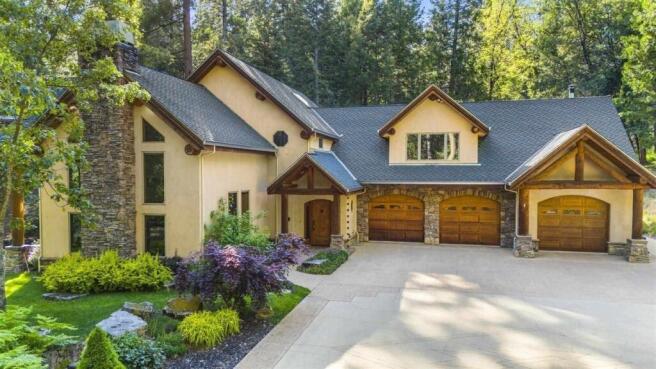 Welcome to the ultimate mountain sanctuary, where earthy features and natural beauty harmonize to create a haven of serenity. This 4-bedroom, 3.5-bathroom lodge-style luxury home, nestled on 5.8 acres of pristine land in Twain Harte, boasts a unique blend of elegance and comfort, with log, stucco, and stone features that set it apart. Conveniently located just 1/2 mile from downtown and 1/4 mile from HWY 108, this property offers both convenience and seclusion. As you approach via the meandering paved drive, crossing a lit bridge, the tranquil sounds of TurnBack Creek welcome you, while towering native trees frame the picturesque setting. Privacy is paramount, with the estate bordered by Stanislaus National Forest, ensuring a retreat from the hustle and bustle of everyday life. Step inside, and you'll be immediately struck by the grandeur of the great room, reminiscent of the iconic Ahwahnee Hotel in Yosemite Valley. The focal point is the wood-burning fireplace, a masterpiece of craftsmanship featuring a log mantle, a stunning 6 x 18‘ stone wall, and a 14-foot-wide stamped concrete hearth, all evoking the rustic charm of the wilderness. Adorned with Native American motifs, including bear paw tiles crafted from the original Ahwahnee Hotel’s roof slate, this space seamlessly b