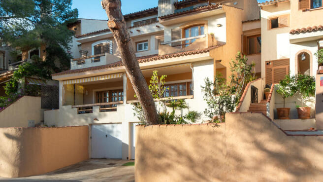 This charming townhouse is located in the popular residential area of Cas Catala, not far from the island's capital, Palma. Its 246 m2 of constructed area and 3 floors are divided as follows: 4 bedrooms, 2 bathrooms, living-dining area, fully equipped fitted kitchen and several terraces offering beautiful views of the surrounding nature. Plenty of peace and privacy are guaranteed. Typical style elements, wooden beam ceilings and floor-to-ceiling windows create a cosy, mallorcan charm. A community pool provides refreshing coolness in the summer.