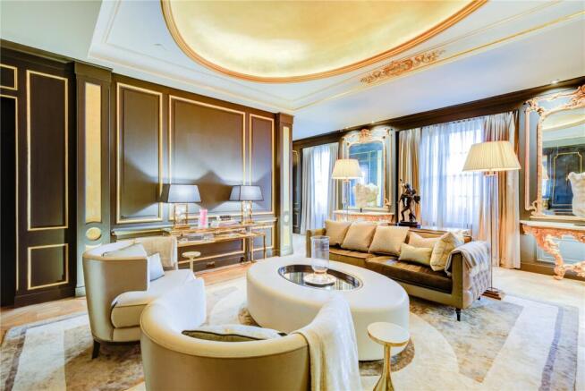 The luxurious velvet seating, framed in gold, makes a striking statement, perfectly complemented by intricate wall paneling and bespoke decor that brings the room to life. The sculpted ceiling and ornate wall detailing create a sense of timeless sophistication. A grand fireplace further enhances the sense of warmth and luxury.