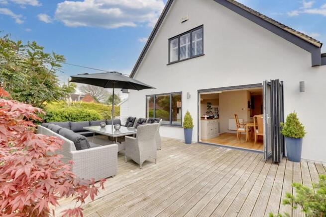 Outside a gravel driveway provides ample parking for a number of vehicles and leads to the electric roll up garage doors, one offering access for a vehicle or motorbikes. The current owners store a large camper van on the driveway and an area offers space for such a vehicle or caravan to be tucked away behind the bushes to the right. A secure gate leads into the main garden with a footpaths leading to the main entrance to the property and a timber outbuilding that could make for an ideal home office and gym or expansive summer house. A lawn leads to a pond surrounded by a number of seating areas. Steps lead up to a expansive decking area with space for a large dining table, there are spaces for a bbq and hot tub. Bi-fold doors open into the dining room and in turn kitchen and a side return to the rear courtyard with gate allowing access to the annexe if required.