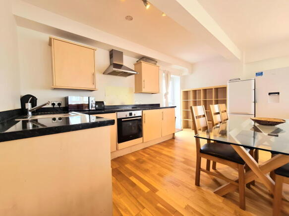 - Open-plan kitchen, dining, and living area with modern fittings