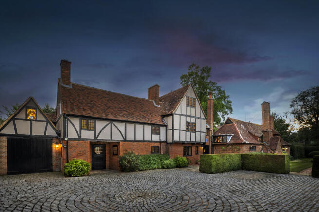 The property is set behind electric wrought iron gates, leading to an ample driveway with plenty of parking and turning space. The beautifully manicured lawns to the right with immaculate hedges and topiary frame the front of the house and are reminiscent of a stately home. The secluded rear garden is landscaped with seating areas, walkways, an abundance of mature shrubs and plants, a pergola and a pond.