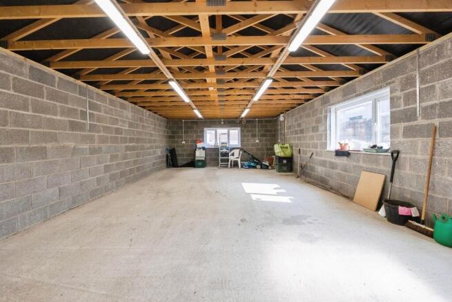Large double garage access via garden. Double glazed window. Light and power. Electric door.