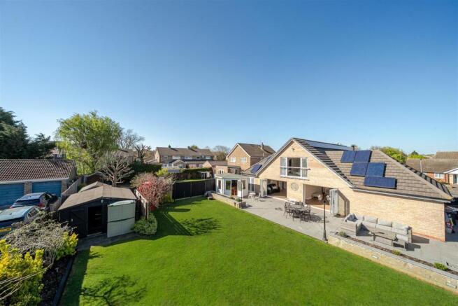 Stepping outside, the property is set on an impressive south facing plot of 0.19 acres (sts), featuring an expansive patio area ideal for entertaining, complete with its own home bar. The entertainment space and garden are defined by a charming wall, with the remainder of the garden laid to lawn, offering two additional outbuildings/sheds. The space is further enhanced by a border of lush shrubs and trees, providing both privacy and beauty.