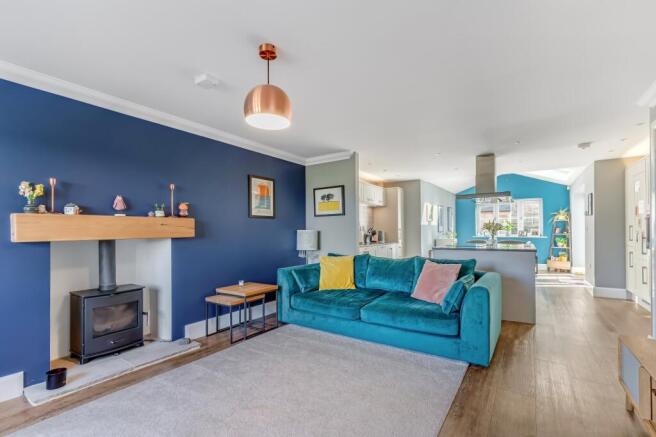 A light and spacious sitting room with log burning stove with wood lintel, window to the front and under stairs storage. Radiator. Open to the kitchen area.