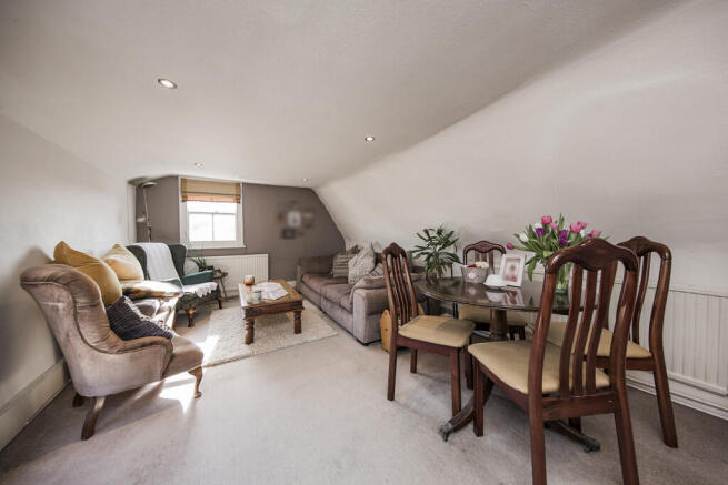 LARGE OPEN PLAN LOUNGE/DINING AREA: Carpeted, two radiators, areas of sloping ceiling, inset spotlights to the ceiling. Ample space for lounge furniture and also for a dining table and chairs. Dual aspect with period sash windows.
