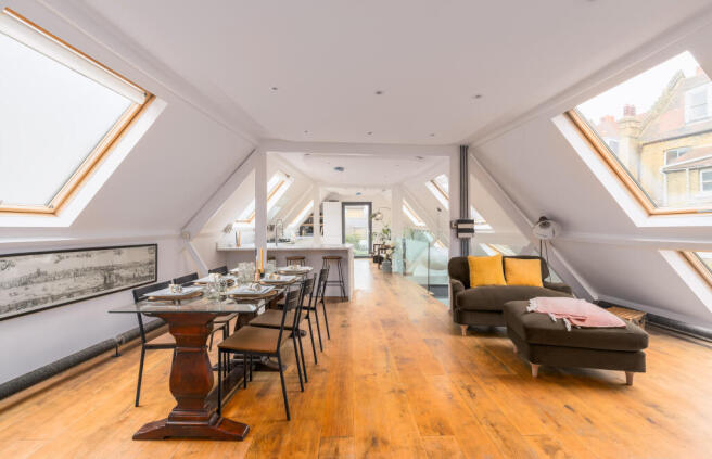 On the first floor is the quite stunning open-plan loft-style living space, exceptionally unique to the area, and providing an open plan space spanning the entire top floor of the property. The open-plan kitchen is stylish and modern with integrated appliances and stone worktops which include a breakfast bar. The dining area is currently set up to accommodate a large 8-seater table (with room for larger if needed) and the sitting area is complemented by bespoke cabinetry and a log-burning fireplace. Large Velux windows throughout flood the space with natural light with wooden flooring, ceiling joists and exposed brickwork really enhancing the loft-space feel.