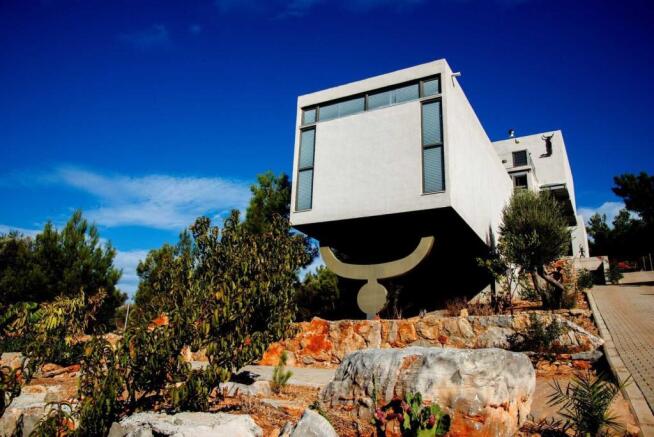 Above this exhibition area, you will find a light and spacious 110 m² two-bedroom home that offers panoramic views of nature. The living area is generously sized, featuring high ceilings and a completely separate kitchen. The luxurious marble and ceramic tile flooring adds elegance, while large windows fill the space with natural light. A cosy fireplace provides warmth during the colder winter months, and split air conditioning units are installed in all rooms for comfort.