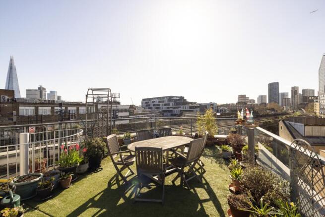 Upstairs, a striking open-plan living/study area is flooded with natural light thanks to floor-to-ceiling windows. Hardwood flooring adds warmth, while the adaptable layout includes a pull-down bed for extra sleeping flexibility. From here, step onto the large south-west facing terrace-a true sun trap and a peaceful escape from the buzz of the city. With panoramic views that include the iconic Shard (and even New Year's Eve fireworks), your private sanctuary.