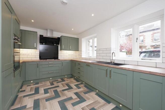 To the right, the heart of the home unfolds in the kitchen-diner. Designed with both style and functionality in mind, this space features green shaker-style units from Rossendales, topped with premium worktops. Integrated Stoves 70:30 fridge freezer, Stoves dishwasher, Caple double oven and grill, and Caple gas hobs make cooking a joy. Pelmet and kickboard lighting add subtle sophistication, while large windows flood the room with natural light.