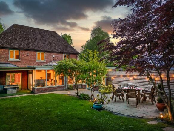 From here you can step out and take a tour of your lovingly crafted garden. Peppered with elegant planting and areas for all of the family to enjoy, young and old. A large patio is placed near to the kitchen area and attracts the sun into the evening.