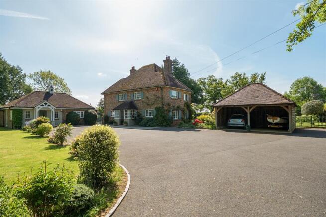 Outside - The home is approached via a long sweeping drive which is walled on either side. Currently there are no electronic security gates, however, there is the opportunity to add these for further peace of mind. The driveway in turn leads to the front of the home and the detached open carport plus the annex. The drive could accommodate 20+ vehicles, boats, caravans or trailers for horses. An ornate open storm porch greets you at the front door.