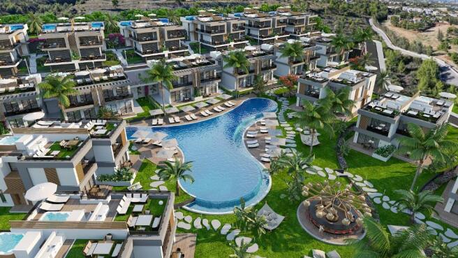 Comprising a total of 56 residences , including 12 luxurious detached villas and 44 semi-detached flats, These Villas are situated on Turkish title deed land, ensuring ownership security and peace of mind for residents. With modern exterior designs and inspired interior layouts, our Villas are poised to become the epitome of sophisticated living in Kyrenia, offering a lifestyle of unparalleled elegance and comfort. Each villa boasts open and closed car parking facilities, while the Social Activity Area features a refreshing shower and a vitamin bar, perfect for rejuvenation and relaxation. Residents can also enjoy not one, but two common swimming pools & one measuring 360 m2 and the other 350 m2 along with children's pools and ample sun terraces and green spaces spanning 7,500 m2. Safety and security are paramount, with features including site security barriers, a security building, a comprehensive security camera system, and site-wide lighting. Additional amenities such as a central water tank and generator ensure uninterrupted comfort for residents.