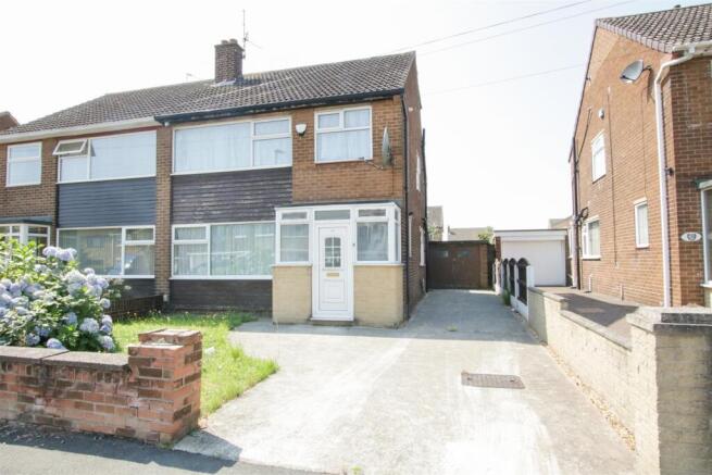 Outside - To the front of the property there is a lawned garden with flowering shrubs set to one corner and a dropped curb providing access to a side driveway, which in turn leads to an attached brick garage.