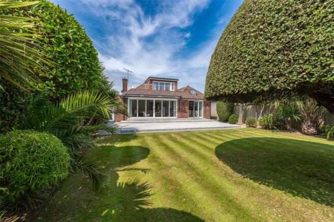 Set back on a tranquil close in South Ferring this immaculately presented chalet-bungalow offers substantial and exclusive living in a highly sought after coastal village. The main door takes you into a porch and on through to a large reception hall off which all of the accommodation is accessed. Downstairs are two double bedrooms overlooking a peaceful front garden; a contemporary shower room; a cloakroom; an integrated modern kitchen and separate utility room, and a spacious lounge/diner. The skilfully designed integrated kitchen has copious cupboards, drawers and worksurfaces and is fitted with quality Miele appliances including a double wall oven, an induction hob, and a dishwasher as well as a free-standing American style fridge/freezer. There is also a large central island incorporating a breakfast bar. Adjacent is the dedicated utility room. Glazed internal french doors take you through into a very spacious lounge. Both the kitchen and lounge have wide Bi-fold doors allowing plenty of natural light into the property and offering access to the rear patio and garden allowing ‘indoor/outdoor’ living. A flight of stairs leads up to the main bedroom suite which has a contemporary bathroom with a corner bath and separate shower. Natural light streams into the room through Velux windows and Bi-fold doors. The Bi-folds allow access to a paved and enclosed balcony, a wonderful area for relaxing and looking out over the rear garden and Sea views.