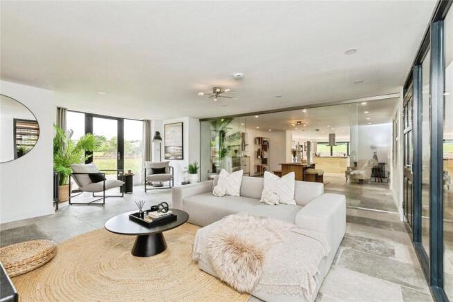 The highlight of the ground floor is undoubtedly the expansive kitchen/dining room, measuring over 22 feet wide. Featuring sleek, modern cabinetry, a large central island with integrated appliances, and panoramic bi-fold doors opening onto the rear garden, the space is perfect for both everyday family life and entertaining on a grand scale. Natural light floods in from every angle, and countryside views create a calming backdrop.