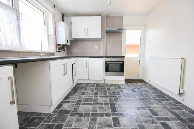The kitchen has a double glazed window to the front and UPVC double glazed door to the side opening to access down the side of the property and the rear garden, laid to vinyl flooring and a radiator to one wall. There is a range of wall and base units with rolltop worktops, a stainless steel sink, an integrated oven and hob, with an extractor over and space for a washing machine and a fridge freezer.
