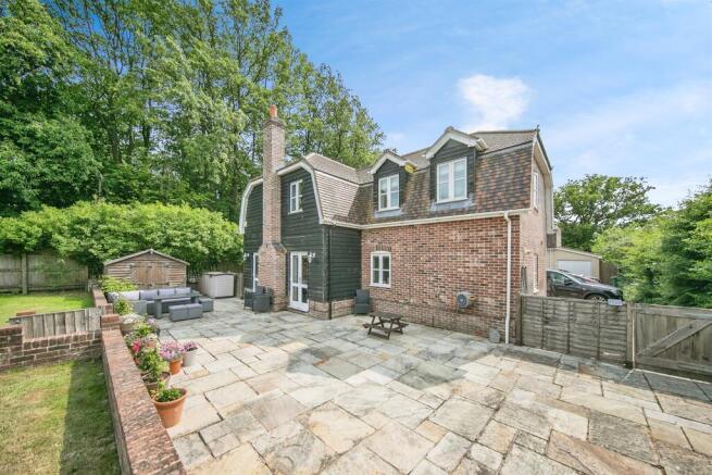 Overlooking fields to the rear and side the enclosed side garden is mainly laid to lawn with a paved patio area, wooden shed and external tap.