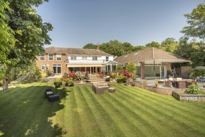 The South facing rear garden is stunning, with its impressive, paved terrace, with steps leading to the immaculate manicured lawn, it is well stocked with borders and trees. The bottom section has a summer house and a more informal feel, perfect for wildlife.