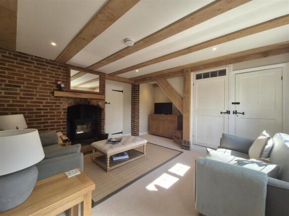 Sitting Room - 4.62 x 3.87 (15'1" x 12'8") - Double glazed window front facing, full height built in storage cupboard, access to the kitchen diner and stairs to the first floor. Bricked fireplace with log burner and tiled hearth.