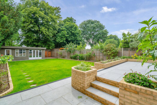 Mature south-facing garden with patio—ideal for entertaining, play, or relaxation.
