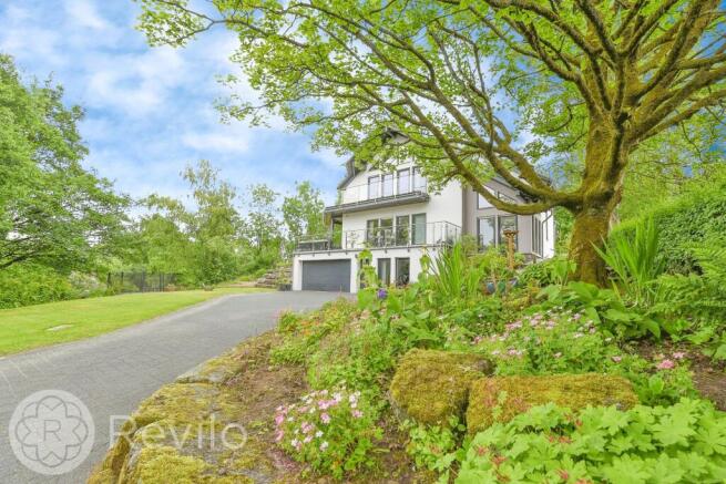 The outdoor space is equally impressive, with extensive lawns, wrap-around terraces, and balconies featuring glass balustrades that offer panoramic views of the surroundings. The property has been thoughtfully designed to make the most of its picturesque setting and natural light, with extensive and well-designed glazing throughout.