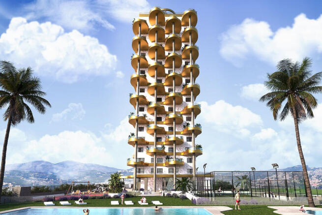 Three-bedroom, two-bathroom apartments with spacious terraces overlooking the sea, with garage and storage rooms included in the price. The design is simply fantastic, inspired by a tree with ceramic cladding and golden leaves that shape the terraces.