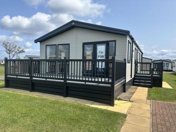 The lodge sits on a spacious plot and includes full wraparound decking, ideal for outdoor lounging, BBQs, or enjoying the sea breeze. Its exterior is clad in a tasteful two-tone finish with anthracite trim, offering both durability and style. The surrounding area is fully paved and landscaped for easy maintenance.