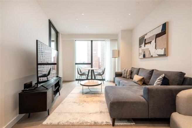 The flat features a bright open-plan living and kitchen area with high-end finishes throughout, a spacious double bedroom with built-in storage, and a sleek, contemporary bathroom. Floor-to-ceiling windows provide great natural light and city views.