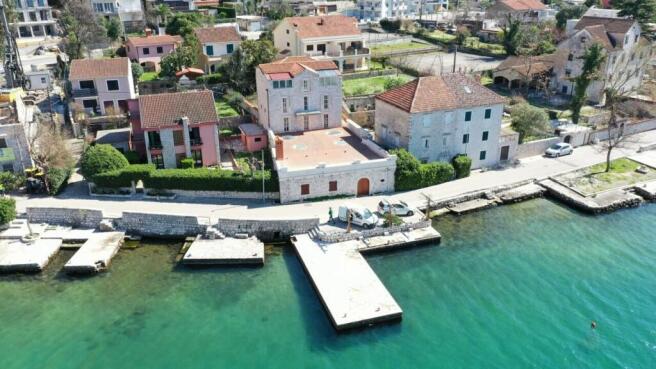 Situated on the seafront in Dobrota, this unique estate offers a rare opportunity. The property is divided into two parts: a commercial space at the front and a four-level main house with a picturesque terrace overlooking the serene waters. Currently undergoing reconstruction, the villa is being sold as-is, with new features including an elevator and underfloor heating.