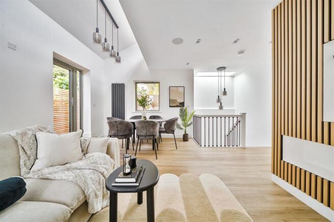 Bathed in natural light from floor-to-ceiling windows and a large ceiling lantern, the adjoining reception room is both spacious and serene, offering generous room for both living and dining. Oak fluted panelling adds a warm, textural accent that runs throughout the home, enhancing its contemporary aesthetic.