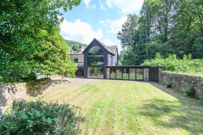 To the rear, bifold doors from both the kitchen and lounge open onto a large flagged terrace with a tree at its centre — a natural focal point for al fresco living. A built-in bread oven and charming wendy house add whimsical charm, while stone steps rise through a rockery to a children’s play platform with built-in slide. Beyond lies a gateway into private woodland.
