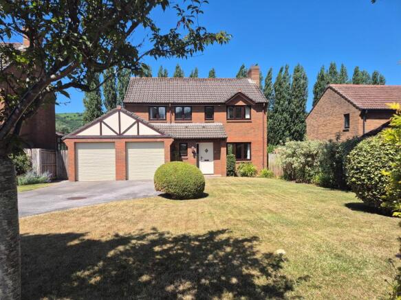 The property is approached over a sweeping tarmac driveway leading to a double garage and providing ample off street parking. To the front is a lawned garden with shrubs and trees. A pedestrian gate at the side gives access to the rear garden.