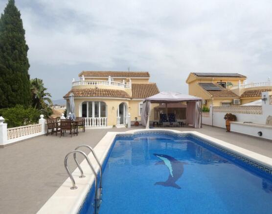 The pool area is located to the rear of the villa, fully tiled for easy maintenance with a garden area to the right with an assortment of trees, including lemon, orange and pomegranate. The 8x4 private pool takes centre stage, there's a seating area with a gazebo offering welcome shade, and the addition of a fabulous bar. This is the perfect place for entertaining family and friends and making the most of the hot, sunny Murcian days.